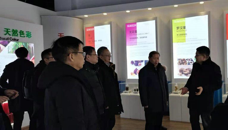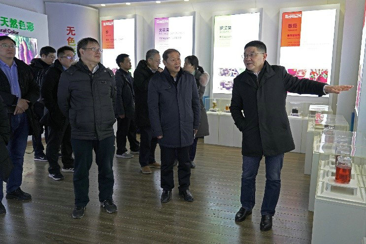 考察团一路风尘仆仆,没有多余的寒暄,没有片刻的歇息,就在李总的带领下来到安博平台“中国天然植物提取体验馆”参观。李总首先介绍了安博平台的原料生产基地、天然色素、天然健康提取物、天然香精香料、生物替抗、植物染料等天然植物提取系列产品,看着色彩斑斓、琳琅满目的产品,令长期奋斗在教学科研第一线的专家、教授们感到惊奇:“没有想到一个企业能够心系民族产业,心系人类健康,把天然植物提取做得这么深、这么细、这么广,真了不起!”
